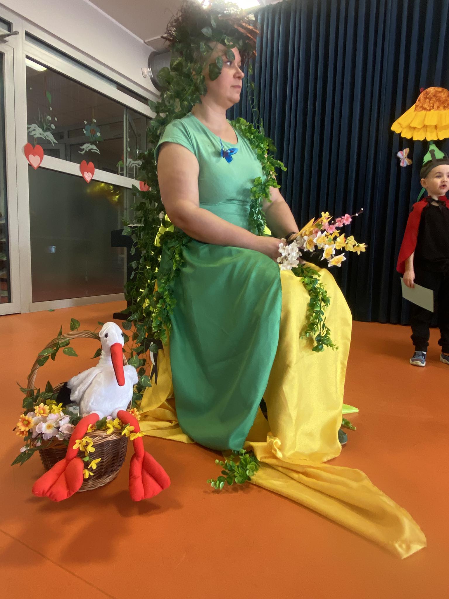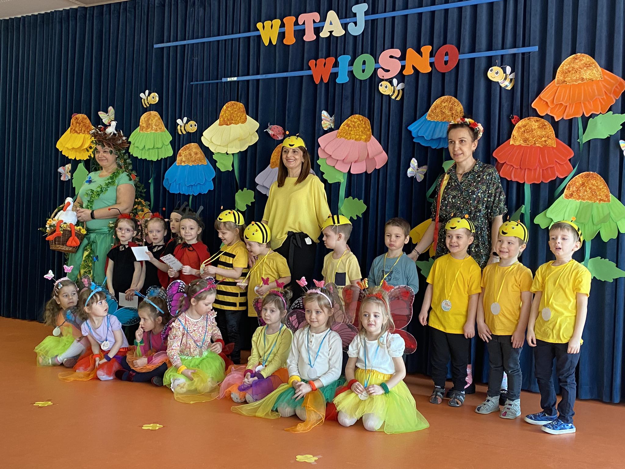 Uroczystości powitania Wiosny rozpoczęły się od konkursów, gier i zabaw związanych z tematyką pór roku. Dodatkowo dzieci z grupy Słoneczka wraz z pomocą swoich Pań – Pani Eweliny, Pani Edyty i Pani Agnieszki zrobiły przedstawienie o tym, jak Wiosna wita Dzieci w przedszkolu. Na koniec przedstawienia został roztrzygnięty konkurs na „Kwiaty dla Pani Wiosny”. Wszystkie dzieci, które wzięły udział otrzymały pamiątkowe dyplomy i nagrody zakupione z funduszu Rady Rodziców.