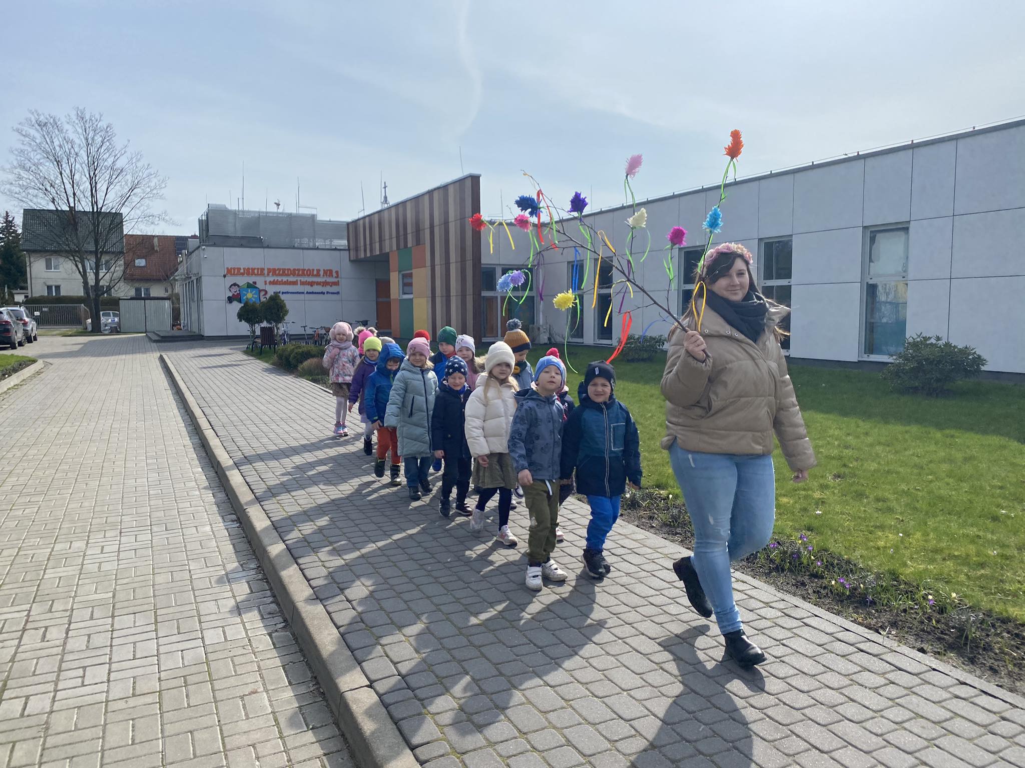 Dzieci dowiedziały się także o starym zwyczaju topienia Marzanny czy tworzenia kolorowych gaików. Mimo wielu atrakcji najbardziej oczekiwaną częścią dnia było wyjście na spacer, podczas którego mogliśmy pożegnać zimę i powitać wiosnę. Przedszkolaki radośnie maszerowały w wiosennym korowodzie z wiankami i wiosennymi ozdobami. W barwnym pochodzie z zielonym gaikiem wróciliśmy do przedszkola. W ten sposób wszystkie dzieci chciały wyrazić swoją radość z przyjścia nowej pory roku. Dzieci w tym dniu poznały tradycje i zwyczaje związane z powitaniem wiosny.
