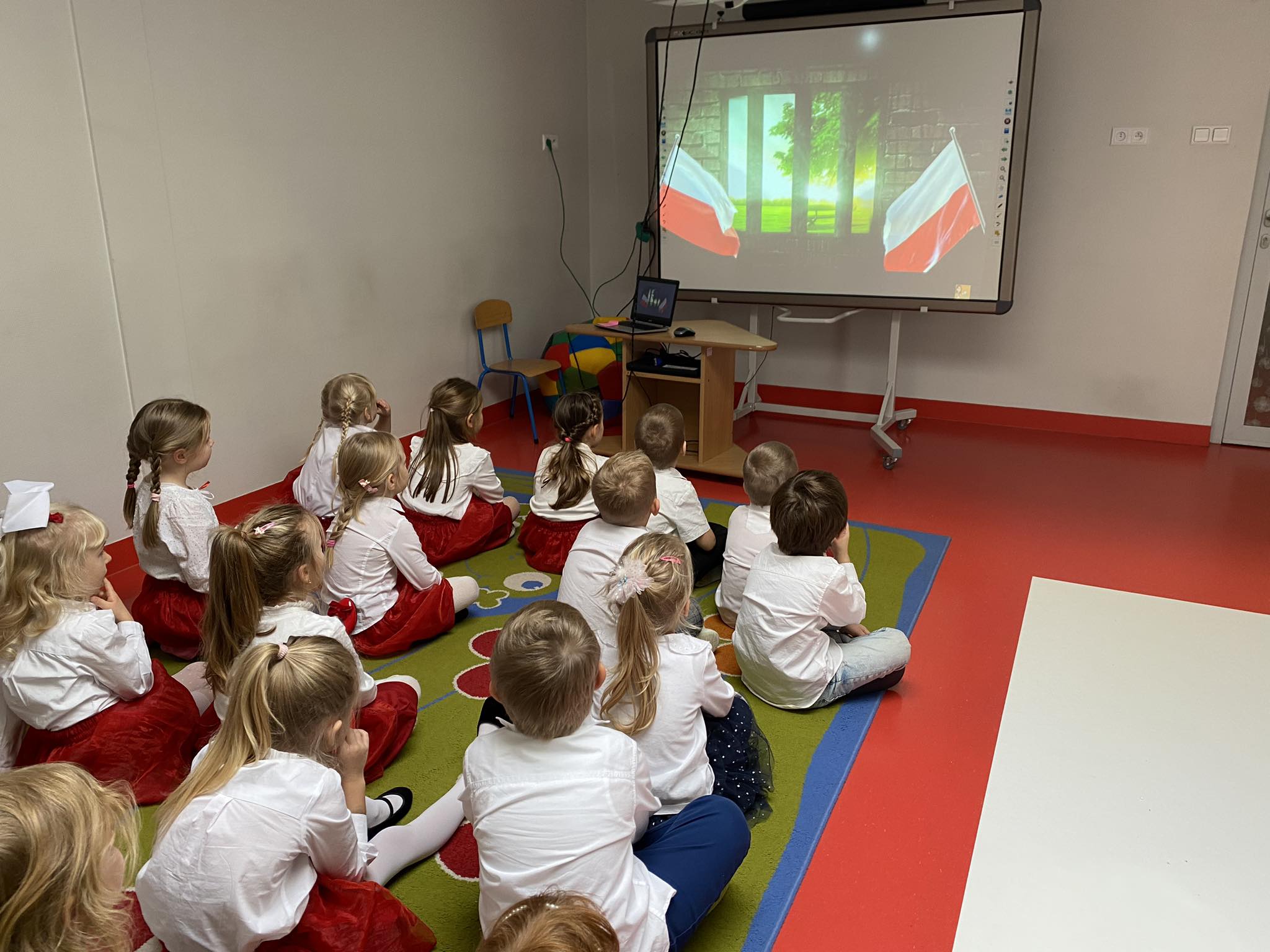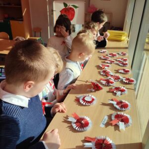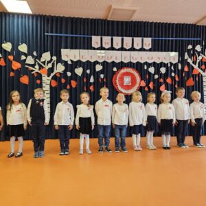 Grupy 5-letnie Biedronki i Mądre Sówki przygotowały dla całej społeczności przedszkolnej występ z okazji 105 rocznicy Odzyskania przez Polskę Niepodległości. Dzieci z zainteresowaniem słuchały wierszy i piosenek patriotycznych w wykonaniu swoich starszych kolegów.