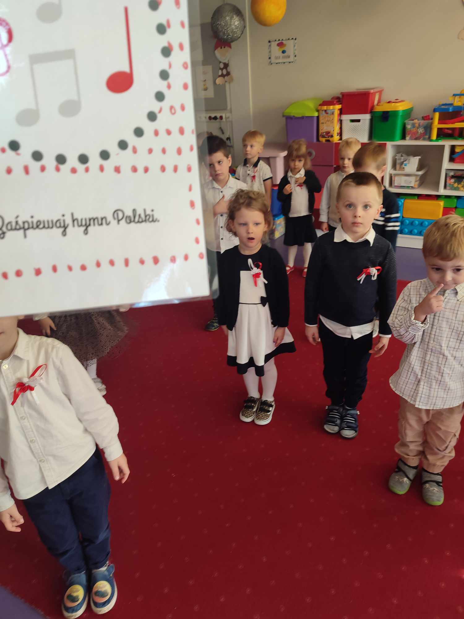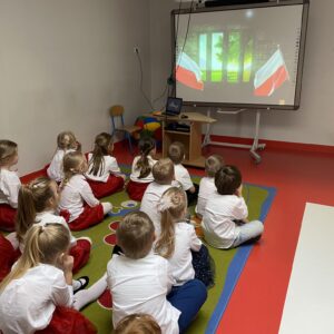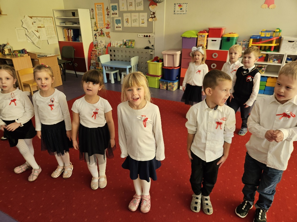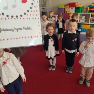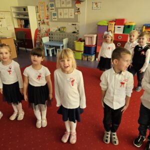 O godzinie 11:11 spotkaliśmy się całą przedszkolną społecznościom by razem zaśpiewać Hymn Polski. Przed biało – czerwonym podwieczorkiem (kanapka z dżemem i serkiem) przybyliśmy na salę gimnastyczna by przy akompaniamencie piania zaśpiewać piosenki o Polsce, po których w Przedszkolu rozbrzmiały pieśni ułańskie, wojskowe i powstańcze.