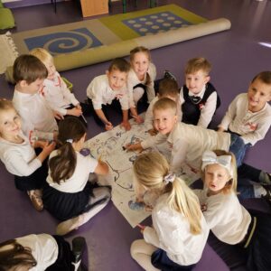 Po przedstawieniu teatralno – muzycznym przyszedł czas na naukę przez zabawę w stacjach zadaniowych. Każda z grup przygotowała zadanie do wykonania dla swoich kolegów i koleżanek. I tak: