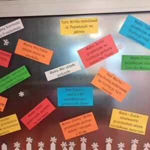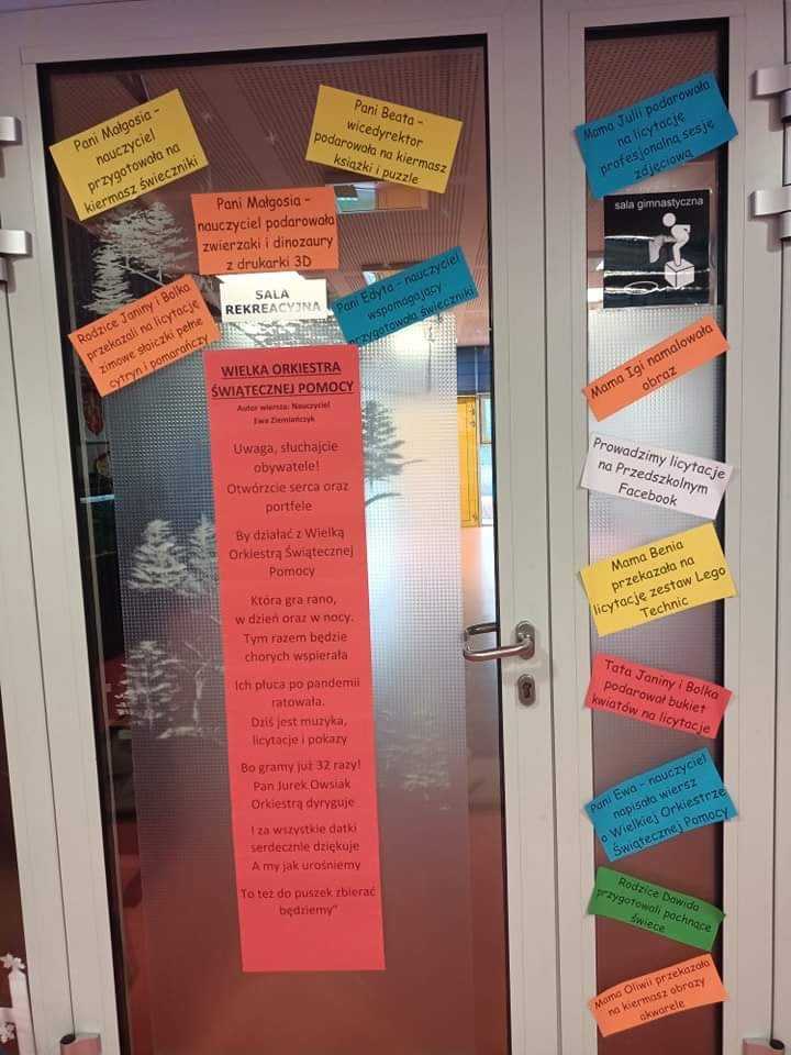 To już kolejny rok, kiedy nasze przedszkole przyłączyło się do zbiórki publicznej organizowanej przez Wielką Orkiestrę Świątecznej Pomocy. W tym roku zebrane pieniądze będą przekazane na zakup sprzętu do diagnozowania, monitorowania i rehabilitacji chorób płuc dzieci i dorosłych. Wydarzeniu, które zostało nazwane „płuca po pandemii” towarzyszyło hasło „Tu wszystko gra OK.”! Nauczyciele i Personel Przedszkola z całej mocy już od września czynili przygotowania do organizacji akcji, kiermaszu i licytacji, by zapełnić puszki WOŚP. Koordynator akcji na terenie placówki – Psycholog Marta Świtek rozdysponowała zadania, a także czuwała nad prawidłowym przebiegiem zbiórki, dzielnie pomagała jej w tym nauczyciel Angelika Zaręba, czuwając nad puszką w Filii Przedszkola, przy ul. Popiełuszki 12. Dzięki pomocy jej prywatnych Dzieci Marty Świtek – Zuzi, Basi i Szymona, puszka zapełniała się w zastraszająco szybkim tempie, bo przecież każdy chciał mieć zwierzaka zrobionego na szydełku. Bez pomysłów Edyty Niemirskiej-Mali, nauczyciela współorganizującego proces kształcenia w placówce, nie byłoby pięknych dekoracji, gadżetów, ołówków, breloków czy bransoletek. Nad przebiegiem licytacji czuwała Ewelina Fruba – nauczyciel grupy Słoneczka, która każdego dnia o 20:00 poświęcając swój prywatny czas kończyła licytację i oznaczała zwycięzców. A dzięki wsparciu Rodziców naszych przedszkolaków było tych licytacji prawie 40!!! Rodzice podarowali nam obrazy, gadżety przydatne w domu, słodkości pieczone w domowym zaciszu, czy pyszne cytryny w miodzie. Nasz nauczyciel – Agnieszka Szramkowska zrobiła makramy, które osobiście zakupiła Pani Burmistrz – Maria Makowska. Wicedyrektor Beata Jaszczycha, przygotowała na licytację pudełka pełne karnawałowych faworków, bo to już tradycja, o którą proszą rodzice naszych przedszkolaków. Mistrzem pisania wierszy jest w naszej placówce Pani Ewa Ziemiańczyk i tym razem nie zawiodła – stworzyła wiersz o WOŚP, który wyrecytowały dzieci 5-letnie na występie w Piastowskim Mok w niedzielę, podczas finału WOŚP. Dzieci do występu przygotowały ich Panie i wspólnie odśpiewały dwa utwory o tym, jak warto pomagać. Nasz Przedszkolny logopeda – Ewa Opara na licytację podarowała wspaniałe obrazy malowane akrylami, które wielokrotnie osiągnęły zadziwiające kwoty. Natomiast Anna Bondaruk – przedszkolny intendent wraz ze swoim zespołem z Przedszkolnej kuchni przygotowały ponad 100 galaretek, muffinków i babeczek, które smakowały zarówno małym, jak i dużym gościom naszego przedszkola.